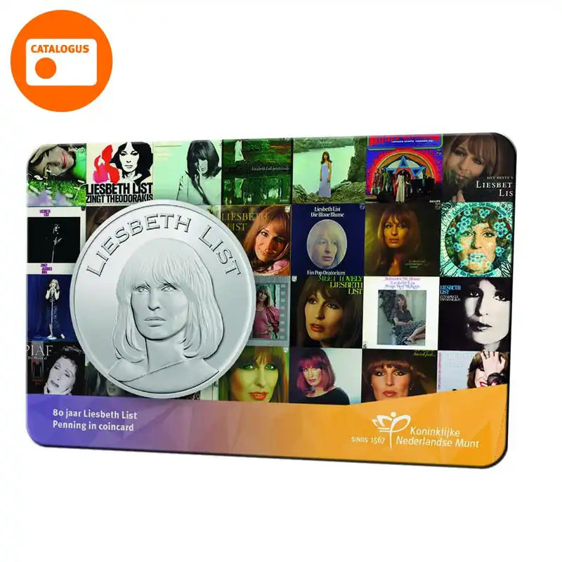 Op 25 maart 2020 zijn we tijdens de coronaperiode in stilte een van de grootste artiesten van Nederland verloren: Liesbeth List. La List had een omvangrijke muzikale carrière van ruim 55 jaar. Om de grande dame postuum te eren, slaat de Koninklijke Nederlandse Munt een speciale uitgifte.Een eerbetoon aan een legendarische artiestLiesbeth List (12 december 1941) had al op jonge leeftijd interesse in literatuur, kunst en muziek. Ze trad in 1962 voor het eerst op op televisie, bij de talentenshow Nieuwe Oogst en de Rob de Nijs Show. Hierna gaat het snel met haar carrière. Ze krijgt groot succes met het theaterprogramma Shaffy Chantant, waarbij ze een levenslange (muzikale) band opbouwt met artiest Ramses Shaffy. Vanaf eind jaren ’60 boekte List ook in het buitenland succes en werkte zij samen met grote namen als Charles Aznavour, Rod McKuen en Gilbert Bécaud. Verschillende platen kregen een gouden of platinastatus. Bovendien werd zij, naast haar muzikale carrière, ook geroemd als actrice na haar rol als Edith Piaf in de musical Piaf. Met de Liesbeth List-uitgiften kijken we terug op de langdurige en indrukwekkende carrière van deze grote Nederlandse artiest.Muzikaal ontwerpHet muzikale ontwerp van de penning in coincard is een ware eerbetoon aan de grote artiest. Op de voorzijde ziet u een klassiek portret van List zoals we haar het beste kennen: met haar haar in een lange bob met pony. Op de keerzijde staat het silhouet van een zingende List met op de achtergrond het reliëf van een vinylplaat. Ook de coincard zelf staat in het teken van Lists beroemde platen en toont LP-hoezen van haar belangrijkste werk.