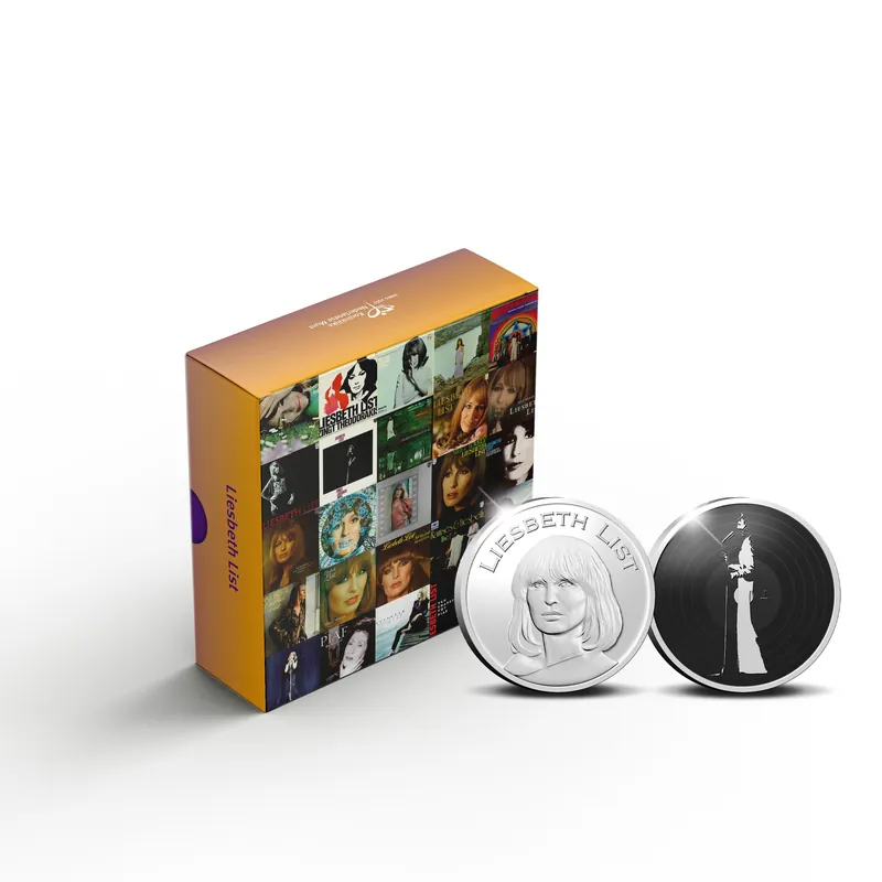 Op 25 maart 2020 zijn we tijdens de coronaperiode in stilte een van de grootste artiesten van Nederland verloren: Liesbeth List. La List had een omvangrijke muzikale carrière van ruim 55 jaar. Om de grande dame postuum te eren, slaat de Koninklijke Nederlandse Munt een speciale uitgifte. Speciaal voor de verzamelaar is de uitgifte ook verkrijgbaar in Zilver Proof met kleur, geleverd in een bijzonder doosje.Een eerbetoon aan een legendarische artiestLiesbeth List (12 december 1941) had al op jonge leeftijd interesse in literatuur, kunst en muziek. Ze trad in 1962 voor het eerst op op televisie, bij de talentenshow Nieuwe Oogst en de Rob de Nijs Show. Hierna gaat het snel met haar carrière. Ze krijgt groot succes met het theaterprogramma Shaffy Chantant, waarbij ze een levenslange (muzikale) band opbouwt met artiest Ramses Shaffy. Vanaf eind jaren ’60 boekte List ook in het buitenland succes en werkte zij samen met grote namen als Charles Aznavour, Rod McKuen en Gilbert Bécaud. Verschillende platen kregen een gouden of platinastatus. Bovendien werd zij, naast haar muzikale carrière, ook geroemd als actrice na haar rol als Edith Piaf in de musical Piaf. Met de Liesbeth List-uitgiften kijken we terug op de langdurige en indrukwekkende carrière van deze grote Nederlandse artiest.Muzikaal ontwerpHet muzikale ontwerp van de zilveren uitgifte is een ware eerbetoon aan de grote artiest. Op de voorzijde ziet u een klassiek portret van List zoals we haar het beste kennen: met haar haar in een lange bob met pony. Op de keerzijde staat het silhouet van een zingende List met op de achtergrond het reliëf van een vinylplaat. De vinylplaat is, net als een echte LP, zwartgekleurd. De uitgifte wordt geslagen in de allerhoogste kwaliteit Proof. Het doosje waar de bijzondere uitgifte in geleverd wordt, toont LP-hoezen van Lists belangrijkste werk. De Liesbeth List penning Zilver Proof wordt geleverd inclusief Certificaat van Echtheid.