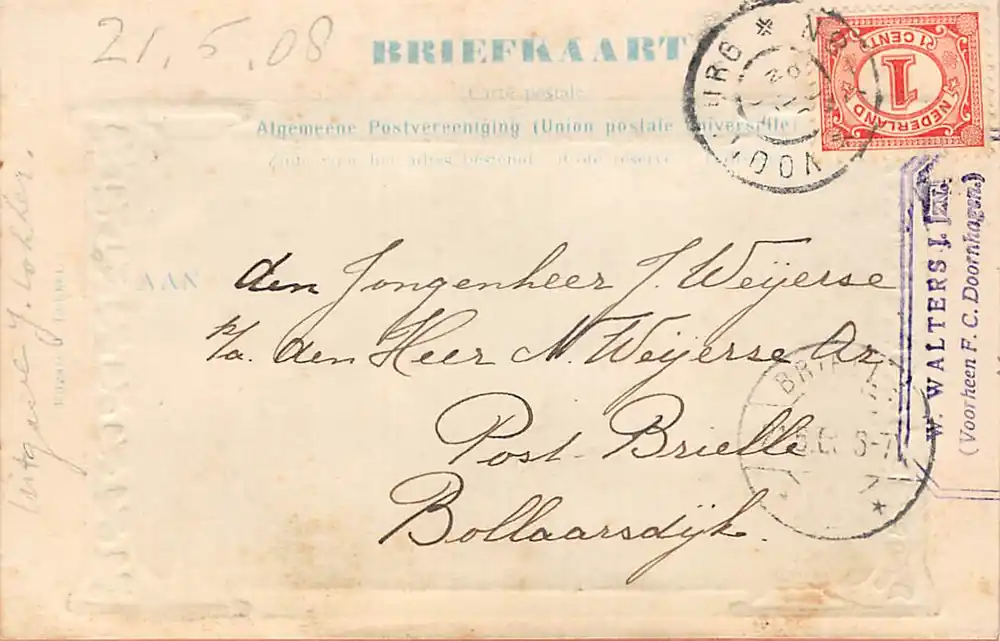 Ansichtkaart met reliëf passepartout met postzegel en stempels begin 1900. Stempeltje W. Walters J. Jzn. (Voorheen F.C. Doornhagen).