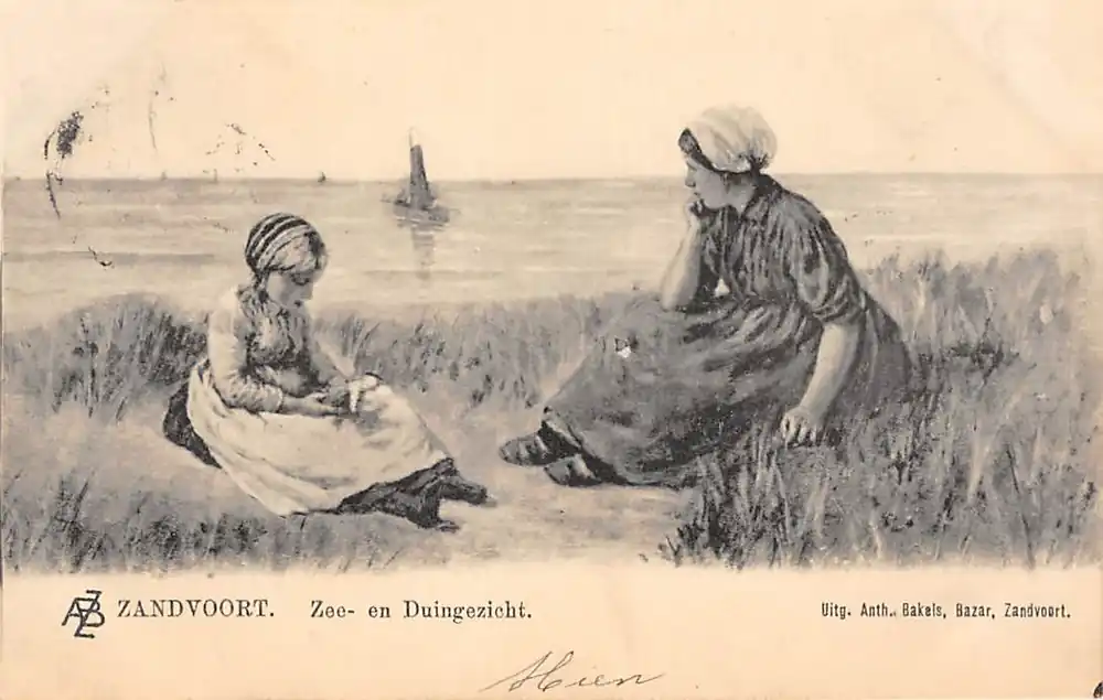 Zandvoort aan Zee Zee- en Duingezicht Moeder en kind in klederdracht Vintage 1904 HC43593 Tylko dziś