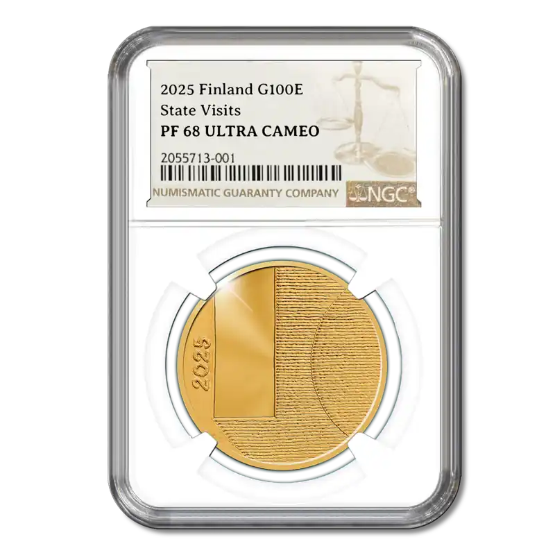 Een gouden munt van aantoonbare perfectie in uw collectie? PF68 munten bieden uitstekende kwaliteit met slechts minimale sporen. Voegt u deze munt toe aan uw collectie? De munt is een uitstekende keuze voor verzamelaars!OntwerpDe 100 Euro 2025 “State Visits of Finland” Goud Proof is ontworpen door Sinikka Inkeroinen-Huhta en Ilkka Huhta. Zij hebben gebruik gemaakt van het design van een deur, om de staatsbezoeken te symboliseren. Achter de deur vinden onderhandelingen plaats, worden relaties gevormd en wordt de toekomst gebouwd. De voorzijde laat een gladde deur zien met de rest van het design in een ruwer design. Op de keerzijde is dit juist andersom.