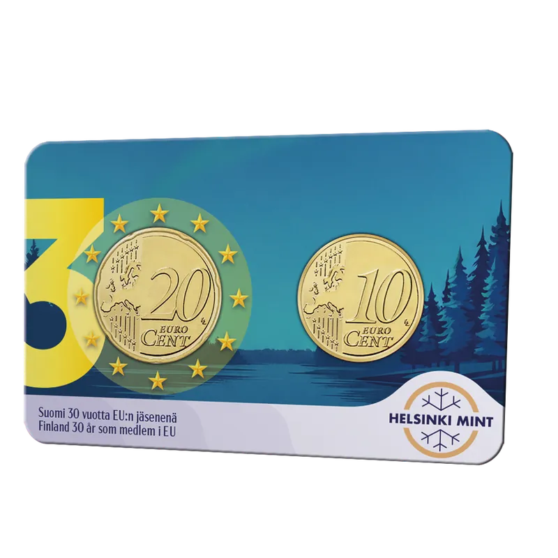 In 1995 treedt Finland toe tot de Europese Unie. In 2025 viert Helsinki Mint 30 jaar Finland in de Europese Unie met 30 cent in coincard.Het Finse EU-beleidVandaag de dag is Finland een actieve, pragmatische en resultaatgerichte EU-lidstaat. Prioriteiten in het beleid zijn het bevorderen van gemeenschappelijke waarden, groei en concurrentievermogen en effectieve regelgeving. Op deze manier kan de externe en interne veiligheid van de Europese Unie worden versterkt.OntwerpVoor deze uitgifte heeft Helsinki Mint Finse eurocenten geslagen: een 20 cent en een 10 cent, en deze in een coincard geplaatst. Dit is de eerste keer dat deze munten in coincard in Finland worden uitgegeven. Op de voorzijde van de coincard is een cijfer 3 zichtbaar, dat “30” vormt met de ronde vorm van de 20 eurocentmunt. De achtergrond toont een illustratie van de Finse natuur. De achterzijde toont verschillende kleine illustraties van Finse wilde dieren.