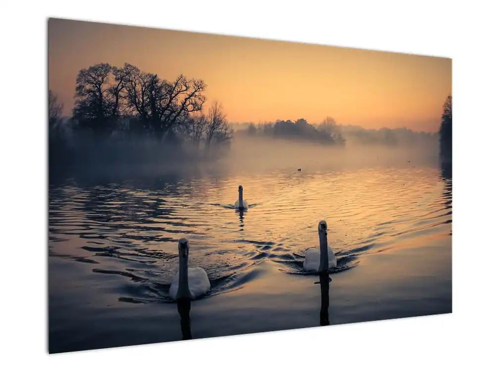Zwrot pieniędzy Schilderij – Zwemmende zwanen in de nevel