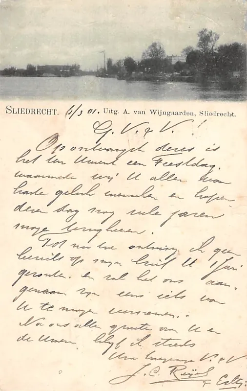 Op de achterzijde staat dat het een voorloper betreft en waarschijnlijk rond 1895 is gedrukt. De kaart is in 1901 verzonden. Uitg. A. van Wijngaarden, Sliedrecht. Postzegel gedeeltelijk afgescheurd.