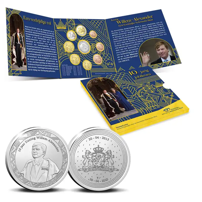 De Themaset van de Koninklijke Nederlandse Munt staat geheel in het teken van het Koningshuis. Deze bijzondere muntset viert jaarlijks de mijlpalen uit het leven van de leden van de Koninklijke familie. Huwelijken, staatsbezoeken, bijzondere publieke optredens, kroonverjaardagen en geboortes komen voorbij in de onder verzamelaars zeer geliefde uitgifte.Themaset 2023Een bijzondere mijlpaal voor Koning Willem-Alexander in 2023 staat centraal in de nieuwste Themaset. De Koning viert zijn 10-jarig jubileum op de troon. In 2013 kondigde de toenmalige Koningin Beatrix in een tv-toespraak haar abdicatie aan. Op 30 april van dat jaar volgt de Prins van Oranje zijn moeder op als staatshoofd. Hij wil zijn Koningschap op een eigentijdse en moderne manier invulling geven. Tijdens 10 jaar Koningschap heeft Koning Willem-Alexander zich laten zien als een betrokken en meelevend vorst, met brede aandacht voor maatschappelijk projecten, innovatieve bedrijven en persoonlijke situaties.Ontwerp De Themaset 2023 staat volledig in het teken van 10 jaar Koningschap. In de drieluik-verpakking is meer te lezen over het 10-jarig jubileum. Op de voorzijde van de verpakking staat een foto van Koning Willem-Alexander met Koningin Máxima op de dag van de inhuldiging.Naast alle acht Nederlandse euromunten van 2023 bevat de set ook een speciale penning, ontworpen voor dit jubileum. De voorzijde toont het portret van Koning Willem-Alexander tijdens zijn inhuldiging. Boven het portret staat de tekst ’10 jaar Koning Willem-Alexander’. Op de keerzijde van de penning staat het Wapen van het Koninkrijk der Nederlanden afgebeeld. Bovenin staat de datum van de inhuldiging, 30-04-2013, onderin staat de datum van het 10-jarig jubileum, 30-04-2023.Specificaties Penning:MetaalZwaar verzilverdGewicht9,38 gramDiameter30 mmKwaliteitBUOplage3.000RandGlad